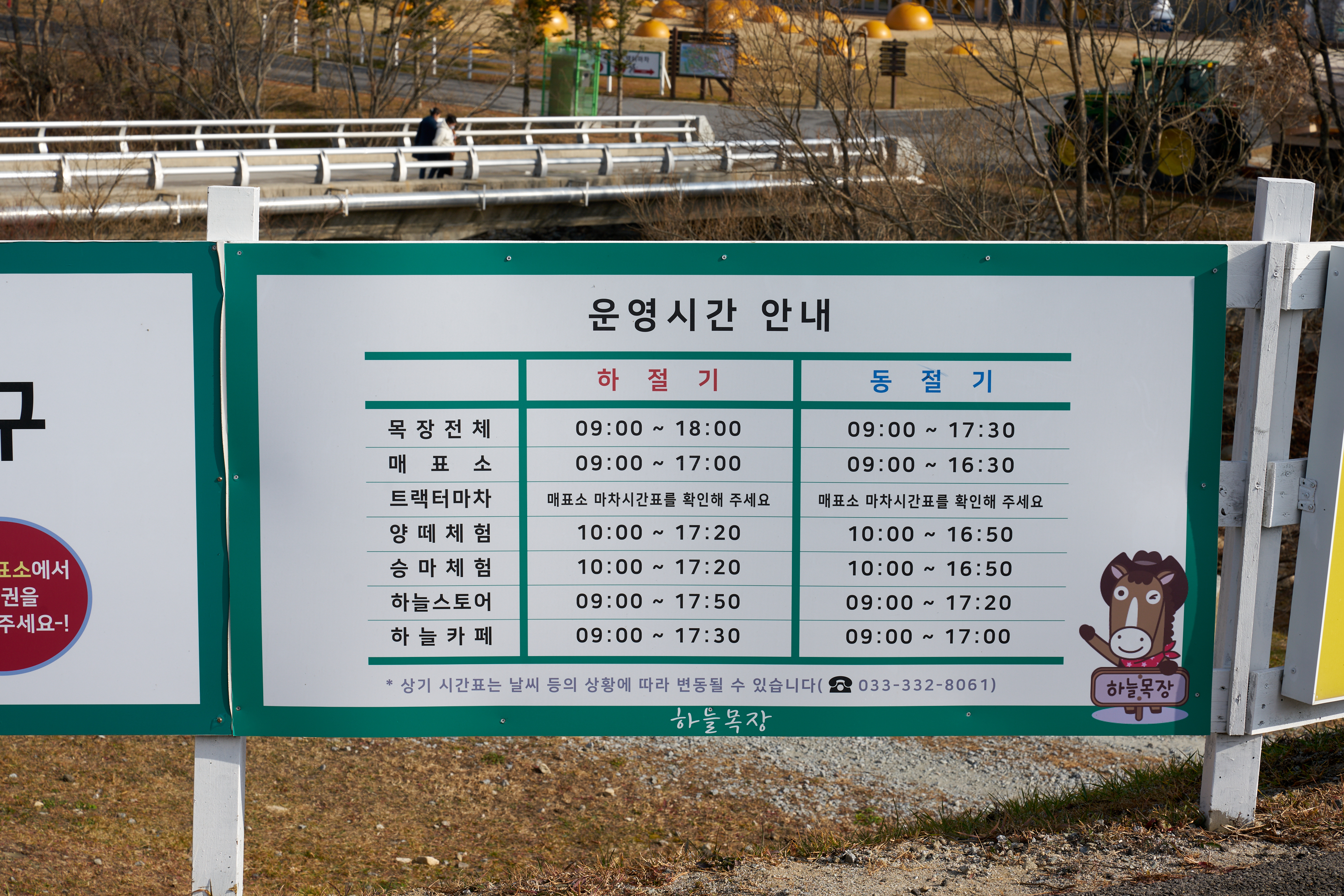 운영시간은 하절기와 동절기 차이가 있고, 시설별 차이가 있다. 트랙터 마차는 매표소 마차시간표를 보면 되는데, 우리가 갔을 땐 매 시간 30분에 출발하고 있었다.