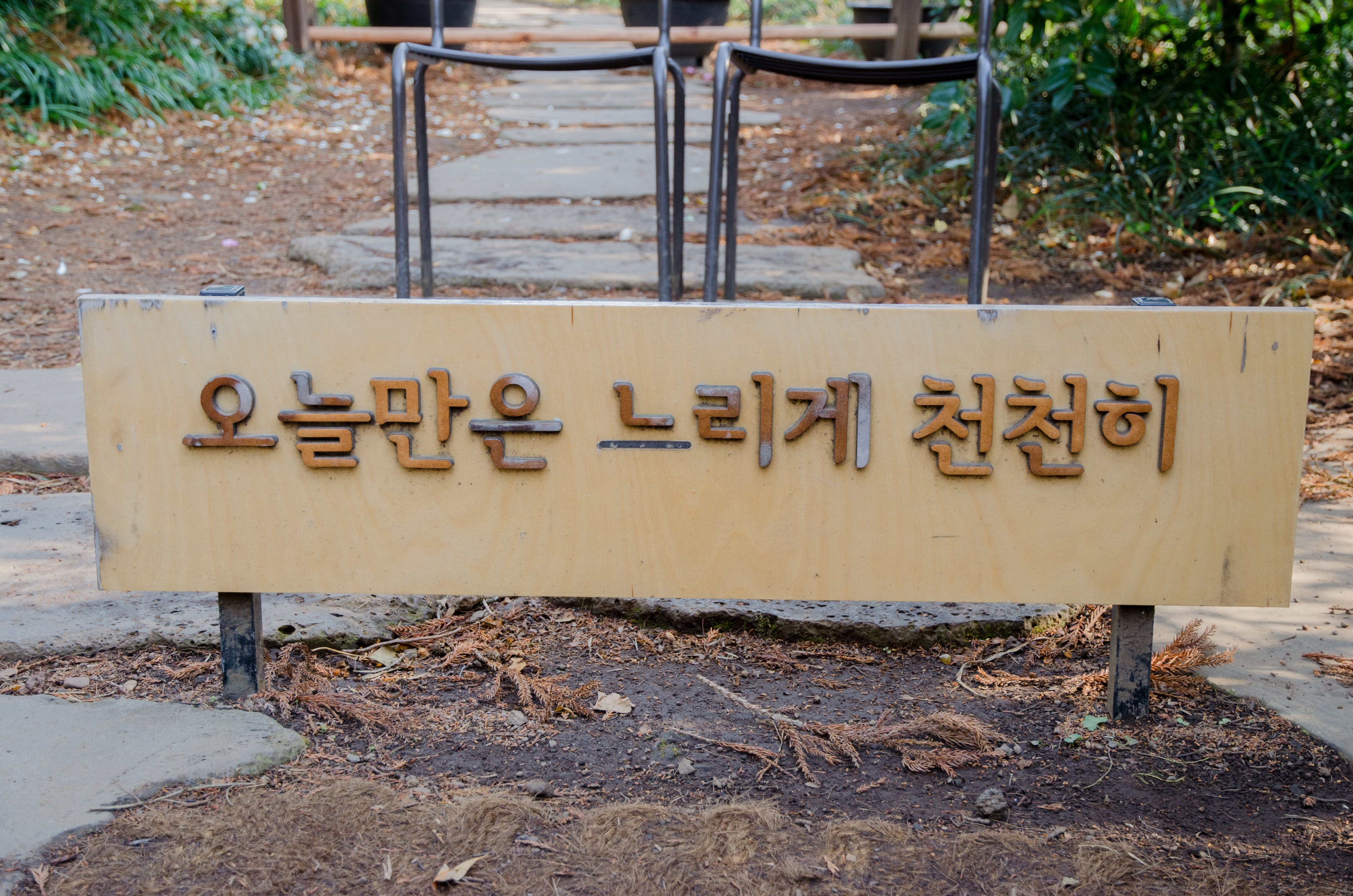 카멜리아힐에는 다양한 포토존이 있는데, 이곳에서 아내와 함께 사진을 찍고 싶었다. 이때쯤 아들의 짜증이 극에 달해서 결국 의자 사진만 남기고 다른 곳으로 이동해야 했다. 이곳에서 사진을 찍고 싶었던 이유는 "오늘만은 느리게 천천히"라는 문구 때문이었는데, 내가 운영했던 블로그와 컨셉과 비슷하기도 했고 내가 원하는 삶의 목표와도 많이 닮아있는 문구였다.